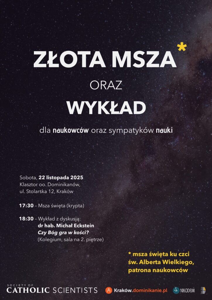 W sobotę, 22 listopada, zapraszamy na kolejną doroczną mszę świętą dla naukowców i sympatyków nauki (tzw. Złota Msza św. ku czci św. Alberta Wielkiego – patrona naukowców), która odbędzie się o godz. 17:30 w krypcie przy atrium. Po mszy św., o godz. 18:30, zapraszamy do sali na 2. piętrze Kolegium na wykład dra hab. Michała Ecksteina pt. „Czy Bóg gra w kości?”.