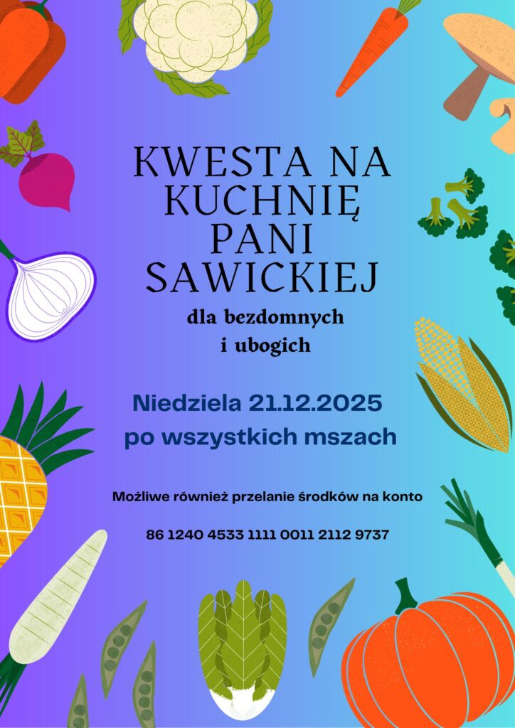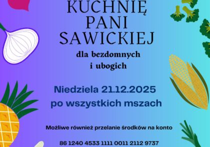 W najbliższą niedzielę 21 grudnia odbędzie się kwesta na rzecz kuchni dla ubogich, którą prowadzi pani Marta Sawicka. Bracia będą czekać na Państwa przed bazyliką po każdej mszy.