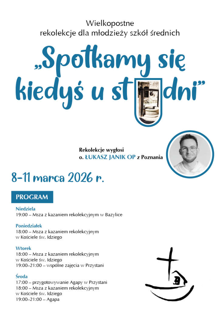 - Wtorek: godz. 18:00 – Msza z kazaniem rekolekcyjnym w Kościele św. Idziego / 19:00–21:00 – wspólne zajęcia w Przystani