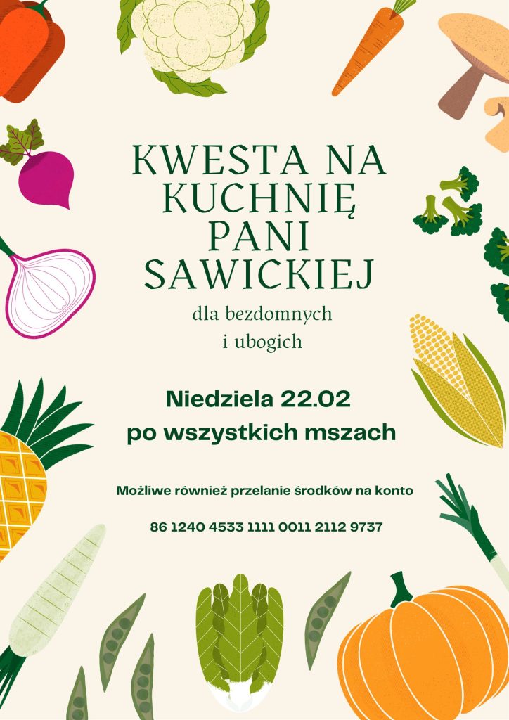 W najbliższą niedzielę 22 lutego odbędzie się kwesta na rzecz kuchni dla ubogich, którą prowadzi pani Marta Sawicka. Bracia będą czekać na Państwa przed bazyliką po każdej mszy.